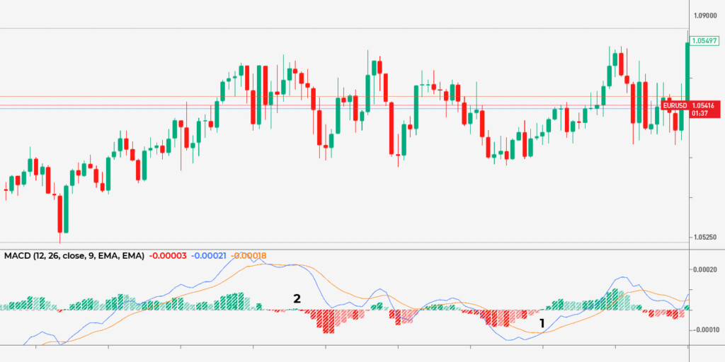 - 0 line crossover. The MACD consists of a histogram and two lines – MACD and a signal line. When the histogram rises above 0, it’s a sign that the price will rise (1). Conversely, when the histogram falls below 0, the price is expected to decline (2). As scalping is done on low timeframes, traders enter the market as soon as a breakout occurs, not when the histogram is above or below 0.