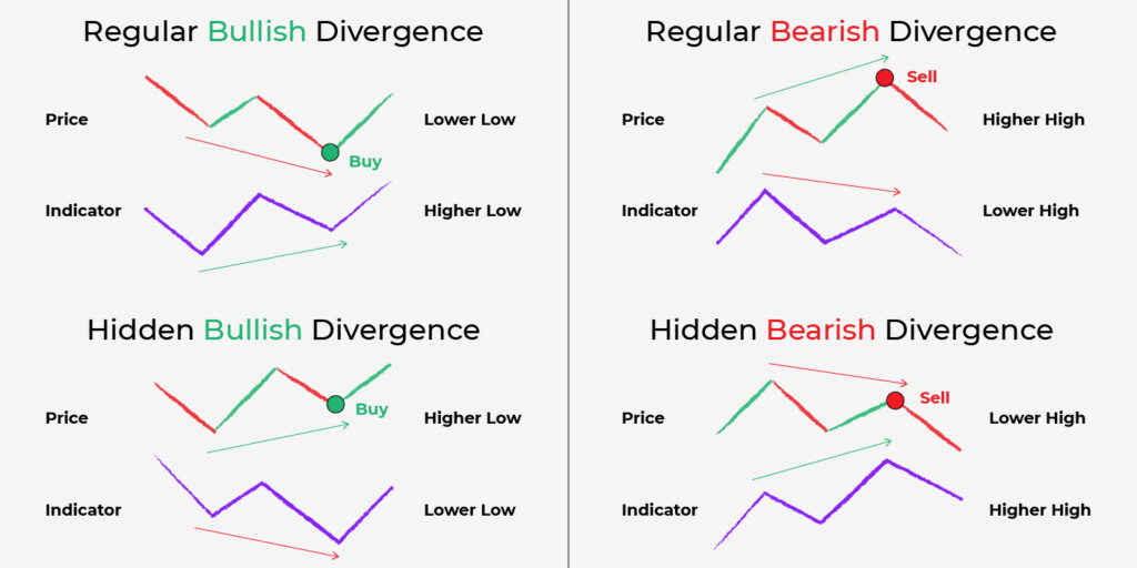 - Convergence/divergence. Convergence/divergence is another popular signal that scalpers use. It appears when the price and the MACD move in different directions – when the price rises, the MACD declines, and vice versa. The four signals are shown in the picture below.