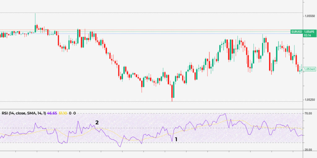 - RSI/SMA crossovers. There is the RSI indicator with the implemented SMA. However, if your trading platform doesn’t provide one, you can manually add the SMA to the oscillator. The period of the SMA is usually the same as the period of the RSI – 14, and the standard deviation should be 1, as a larger one may make signals less effective on short timeframes. When the RSI breaks above the SMA, it’s a buy signal (1). When the RSI falls below the SMA, it’s a sell signal (2).