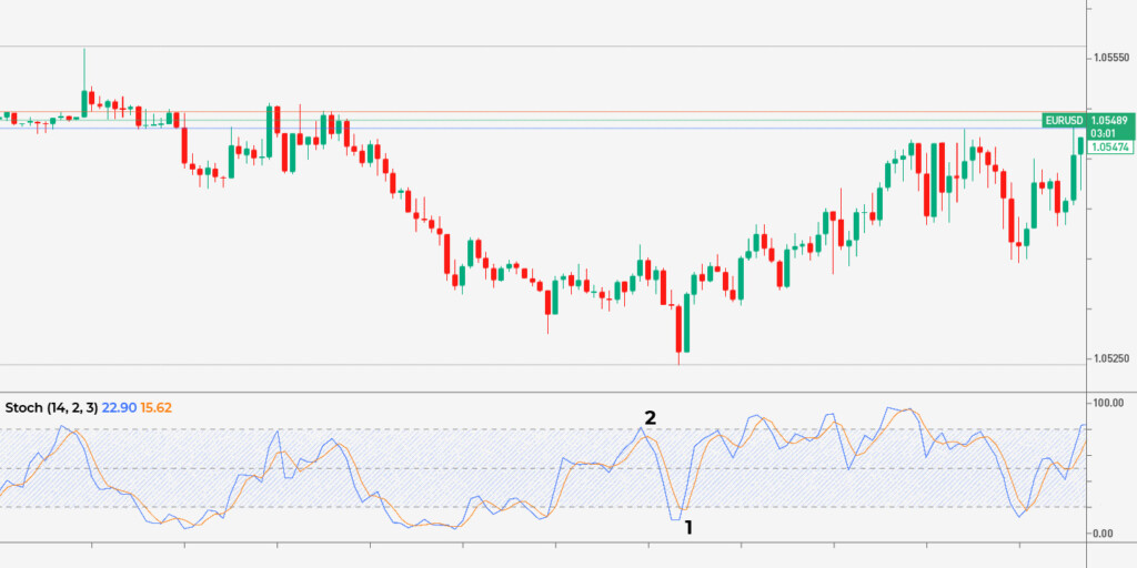As for the RSI indicator, overbought/oversold conditions don’t provide reliable signals for scalpers. Therefore, they use divergence alerts and %K and %D crossovers: when %K rises above %D, the price is expected to increase (1); when %K falls below %D, the price is expected to decline (2).