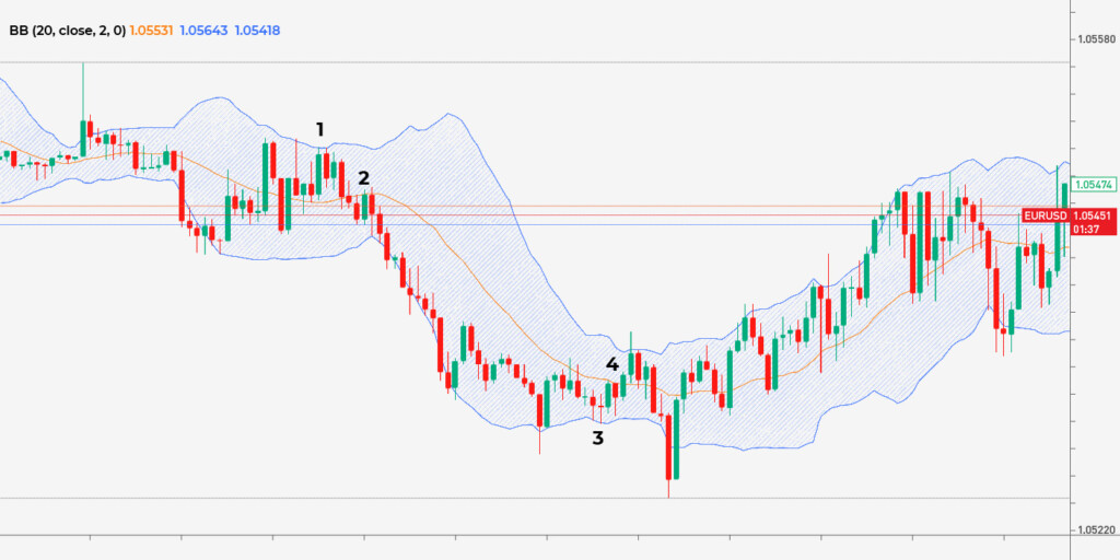 To catch buy/sell signals, you need to look at the price location relative to bands and the middle line. When the price touches the upper band, it’s a sign it will fall soon (1). If the breaks below the middle line, it’s a signal the fall will continue (2). Conversely, when the price touches the lower band, it will likely rise soon (3). A break above the middle line signals the rise continuation (4). You can either open several trades or use a trailing take-profit order.