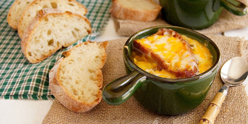 Onion soup is a French dish perfect for cold weather. It’s made with caramelized onions, beef broth, and topped with a crouton and melted Gruyere cheese.