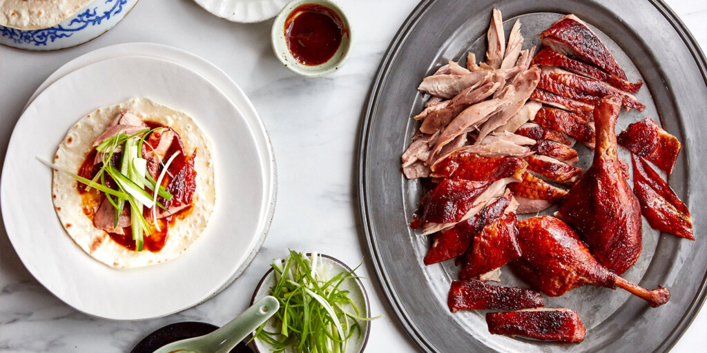 Representing China, Peking duck originated in Beijing and is roasted to perfection and served with thin pancakes, scallions, and hoisin sauce.