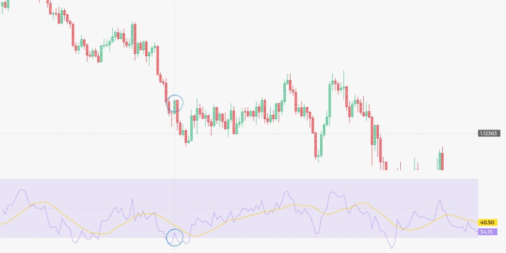 उदाहरण के लिए, RSI इंडिकेटर का नियम कहता है कि जब इंडेक्स ओवरसोल्ड ज़ोन (30 लेवल) छोड़ता है तो खरीदें। सरल लगता है। हालाँकि, यदि आप नीचे दिए गए चार्ट को देखते हैं, तो आप देखेंगे कि इंडेक्स ने ओवरसोल्ड ज़ोन को छोड़ दिया लेकिन अगले दिन वापस आ गया। इस प्रकार, गिरावट अगले चार दिनों तक जारी रही।
