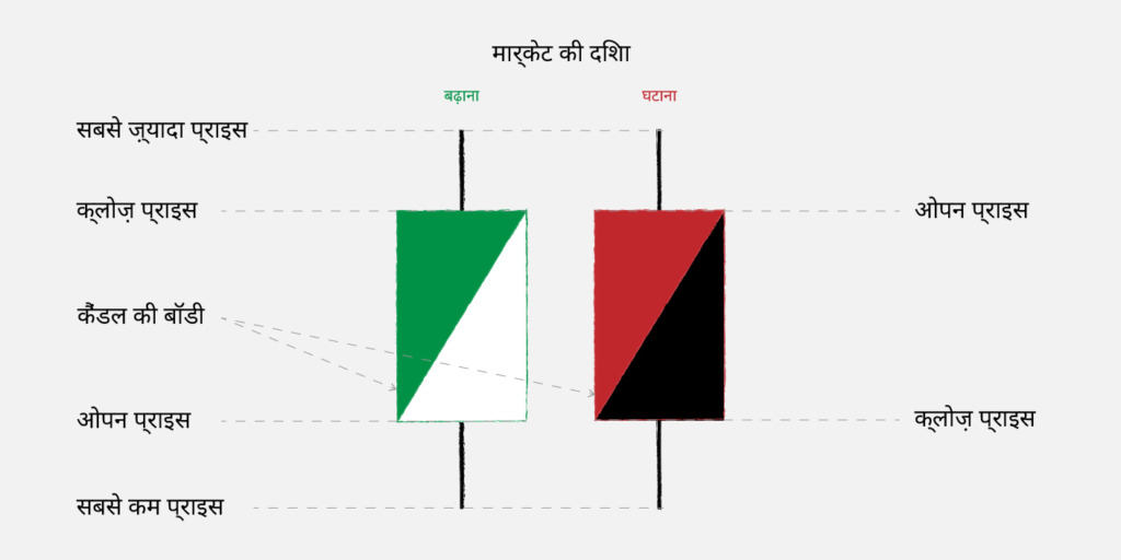 • कैंडल का रंग जो बाजार की दिशा बताता है: लाल या काला मूल्य में कमी दर्शाता है, जबकि हरा या सफेद वृद्धि दर्शाता है