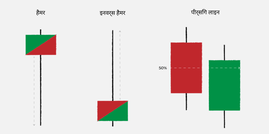 हैमर नीचे एक लंबी बाती के साथ छोटे शरीर वाली होती है, जिन्हें आमतौर पर डाउनवार्ड ट्रेंड में पाया जाता है। हैमर बताती हैं कि भले ही दिन भर बिकवाली का दबाव रहा हो, चाहे लोगों ने मूल रूप से खरीदारी नहीं की, एक मजबूत खरीद दबाव अंततः दिखाई दिया जिससे कीमतें बढ़ गईं। रंग अलग-अलग हो सकते हैं, लेकिन हरे रंग को सबसे अच्छे कैंडलस्टिक पैटर्न में से एक माना जाता है।