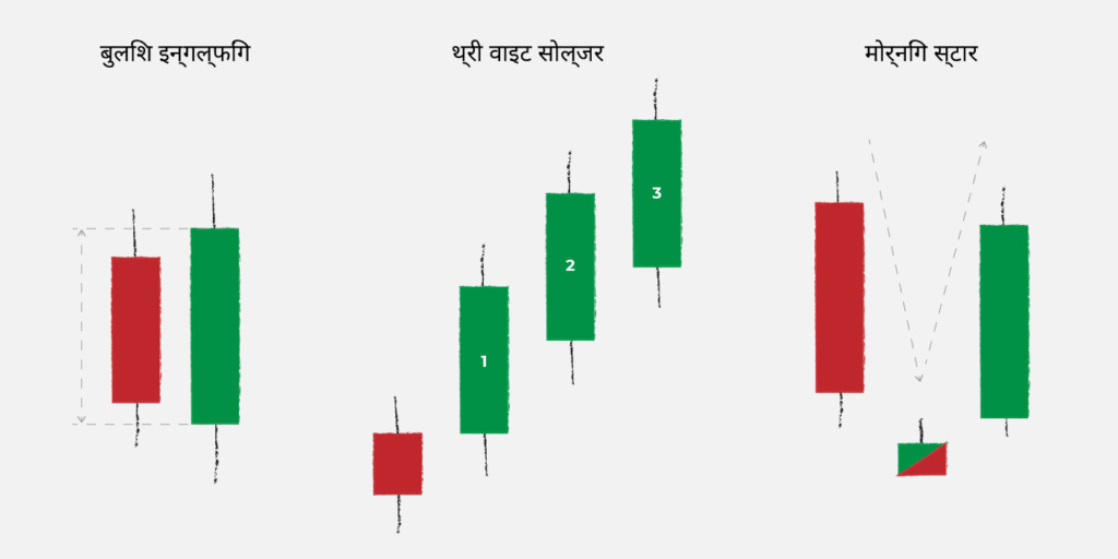 कैंडलस्टिक्स एक निश्चित परिसंपत्ति के प्राइस मूवमेंट के बारे में जानकारी दिखाने का एक अच्छा तरीका है। कई प्रकार के कैंडलस्टिक पैटर्न हैं, जैसे बुलिश और बियरिश कैंडलस्टिक पैटर्न या जापानी कैंडलस्टिक पैटर्न। लेकिन इन सब में से बुलिश पैटर्न सबसे अधिक इस्तेमाल किए जाने वाले पैटर्न में से एक है।