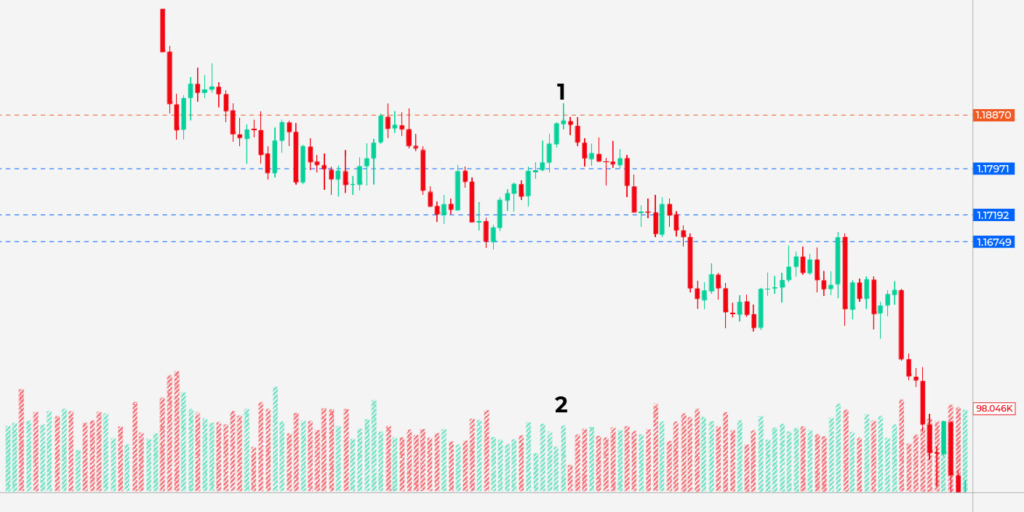Lihatlah grafik di bawah ini. Harga membentuk bar harga bearish (1) pada level resistance yang kuat. Namun, jika Anda memeriksa indikator volume, Anda akan melihat volume bullish yang tinggi (2). Oleh karena itu, Anda memerlukan konfirmasi tambahan untuk memasuki pasar. Tunggu harga membentuk kandil bearish setelah pin bar. Jika kandil kedua bearish, Anda dapat memasuki pasar tepat setelahnya. Tempatkan order stop-loss pada level resistance jika volatilitas pasar rendah dan di atas level tertinggi pin bar jika volatilitas tinggi.