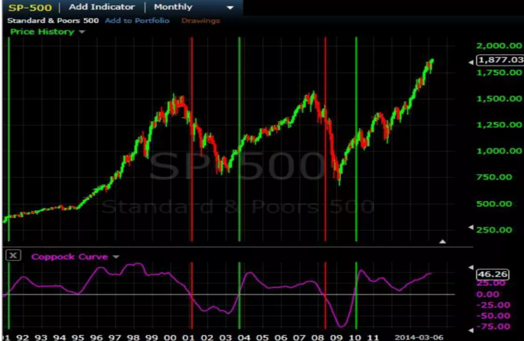 Umumnya, Anda menggunakan Coppock Oscillator Bar untuk mengenali pergeseran ke bawah dan kenaikan dalam indeks Pasar Saham dalam sepuluh bulan. Ini dihitung sebagai jumlah WMA (Weighted Moving Average) sepuluh bulan dari perubahan 14 bulan dan Tingkat Perubahan 14 bulan untuk indeks.