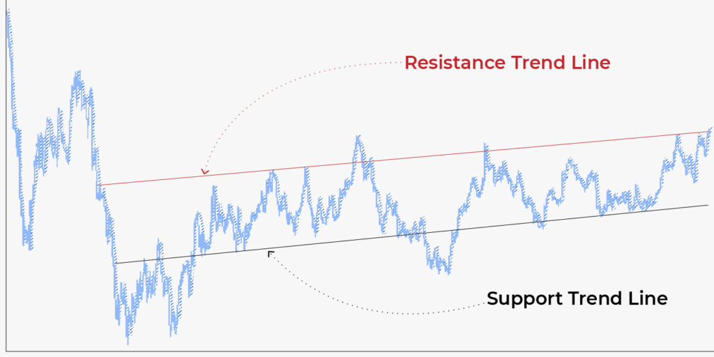 Garis tren digunakan untuk membentuk tren saat ini. Ketika harga bergerak dalam saluran berbingkai, jauh lebih mudah untuk menentukan level potensi rebound. Garis tren berfungsi sebagai target support dan resistance. Ketika harga sampai pada batas atas saluran tren, Anda dapat mengharapkannya untuk jatuh. Oleh karena itu, Anda membuka perdagangan jual setelah rebound. Jika harga berada di dekat batas bawah saluran, Anda harus siap untuk membuka posisi beli setelah harga berbalik.
