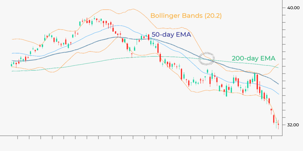As médias móveis examinam o movimento dos preços no passado em prazos definidos, dividindo a soma para obter uma média consistente que é ajustada a cada nova barra. Em comparação com suas irmãs mais conhecidas, as SMAs (médias móveis simples), as EMAs de 50 e 200 dias são mais responsivas. Em essência, o indicador de 200 dias monitora o preço médio de longo prazo de um ativo, enquanto a EMA de 50 dias reflete o preço médio do intervalo.