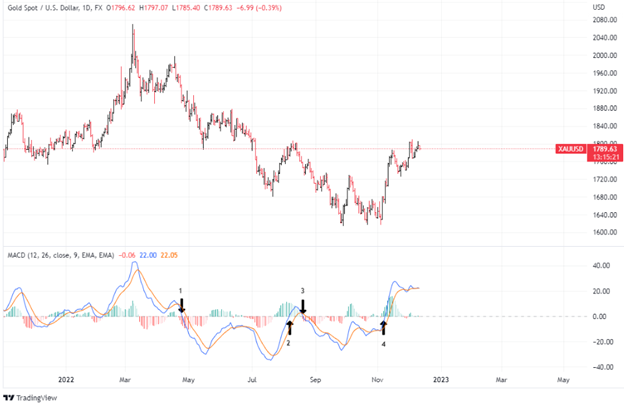 During the timeframe in the chart above, there were four signals in total, with three of those hypothetically giving favorable trades. While taking a position on the crossover of the MACD line and the signal line can potentially help you enter the trade earlier, waiting for a break above and below the zero line helps ensure that a trend is surely in place and hopefully limits the whipsaws.
