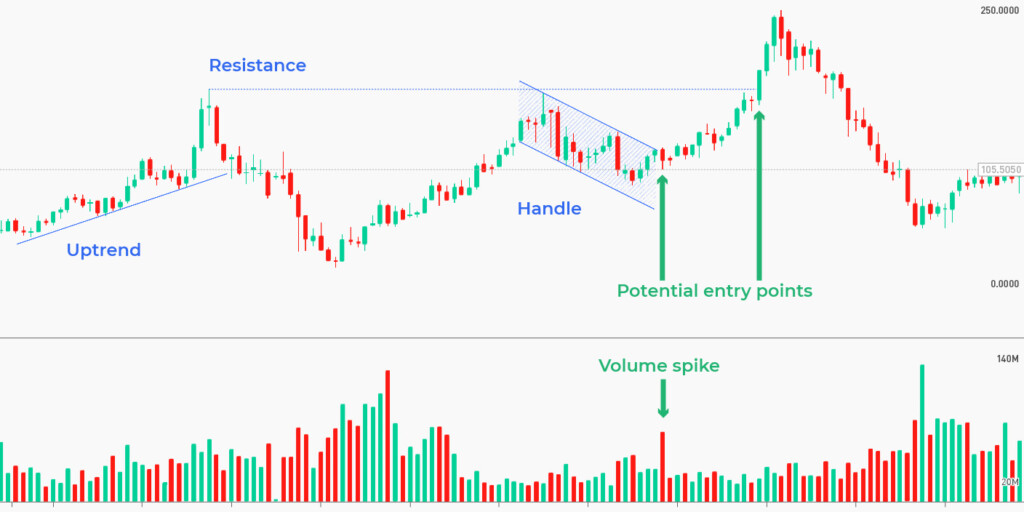 Bu ticaret formasyonu, fincan ve kulp modelinin sağ tarafında işlem hacminin düşük olduğu bir boğa sinyali olarak kabul edilir. Fincan ve kulp formasyonu fiyat grafiğinde 65 haftadan uzun veya 7 haftadan kısa sürede oluşabilir. Fincan ve kulp kuralı ve nasıl bir ticaret stratejisi önerdiği hakkında bilgi verelim