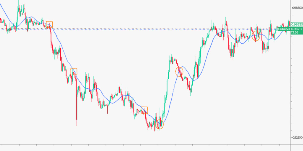 The chart below shows the 30-minute timeframe of the EUR/USD pair and the 21-period moving average. In some cases, the SMA served as support or resistance level (squares); in others, it didn’t (circles).